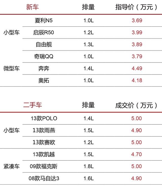 假如买新车或二手车都按照5万元的落地价格来筛选,从上表可以看出: