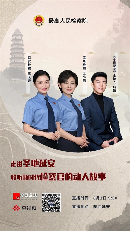 宝塔山,延河水。枣园的灯光,杨家岭的早晨。山丹丹花开红艳艳,信天游永世唱不完。延安,中国革命圣地,中国共产党人在这里孕育出了光照千秋的延安精神。8月2日上午9时,最高人民检察院新闻办与中央广播电视总台《今日说法》栏目、陕西省检察院联合开展第61次“走近一线检察官”直播。此次全程视频直播以“宝塔山下,检察担当映照初心使命”为题,走近陕西延安检察机关,聆听检察官的动人故事。