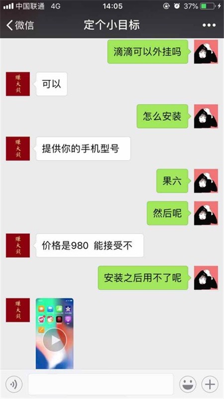 添加 @定个小目标后,对方告诉记者,只需要用微信扫二维码,在通过浏览器安装就可以使用。安装前需要打开手机的设置,信任该应用。安装时,要根据不同手机型号下载软件,使用对应的激活码激活软件,然后再用服务器连接微信小程序“滴滴打车”或连接“滴滴打车”App,就可以完成“作弊软件”的安装,费用只需998元。