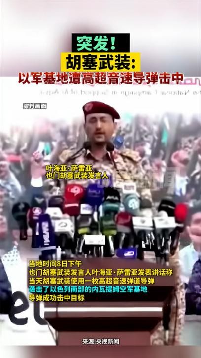 据发言人介绍,这两项军事行动分别是:向以色列南部内瓦提姆空军基地发射弹道导弹,以及在也门焦夫省击落一架美军无人机。萨雷亚表示,这些行动是为了支持巴勒斯坦和黎巴嫩相关组织。