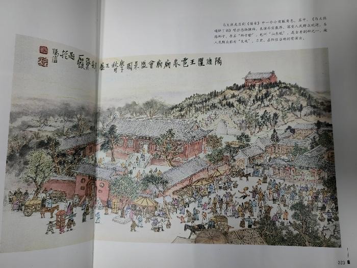 此外,《韩信屯兵处》、《黄巾冢》《狼丘冢》、《玉皇庙》《凌霄阁》《阳信古城》《阳信官学》《梨祖杜母》《长安石桥》《阳信古八景》《阳信正月古庙会》《阳信乡村古建》《阳信百年梨园》《阳信姐妹井》……有的图画写实、有的写意,有的是细致的工笔,有的是话本一样的勾描,有的画出了鲜活的市井民俗,有的画出了借助历史记载的想象,有的是根据康熙《阳信县志》城市图而绘画……