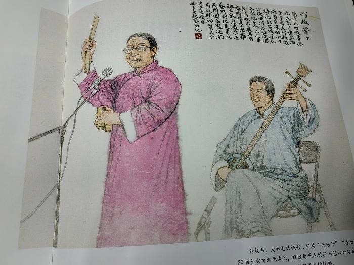 再看《西河大鼓》:“一张巧嘴,啸聚千军万马;一段鼓书,道尽万载春秋……‘俺说这话你要不信,地下埋的全是地上的人。’”再看《鲁绣》:“在绣娘的指尖间温柔倾诉,一丝一线,款款深情,千娇百媚,栩栩如生……”还有《毛竹板书》:“朝为田舍翁,暮作长衫客。一人就是戏一台。风雷动,狼烟起,江湖声声急……”更有《哈拉虎》:“牛骨铃铛哈拉响,三五老汉登台忙……”