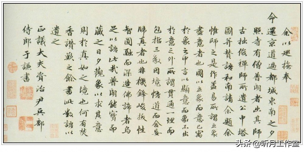 释文:“余以巡抚奉命还京。道过都城东南之夕照寺,有僧普朗者,出其师古拙俊禅师所遗公中塔图并赞语,和南请余题。余惟师之是作,盖易所谓立象尽意者也。图以立象,而意已寓于象之中;言以显意,而象不出于意之外。所谓贯通一理而包括三教,因境悟道而舍妄归真者也。非机锋峻拔、性智圆融而深造佛谛者,乌足以语此哉。普朗能宝而藏之,日夕观象以求其意,则于真如之境也何有。焚香赞叹之余,书此数语以遗之。”