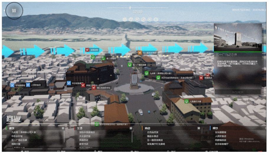 此外,项目内置《绘长沙·五一广场》电子书内容,并提供珍贵历史影像,使用户能够深度体验数十年前的老长沙。通过虚拟漫游功能,用户可以第三人称视角漫游城市,身临其境地感受不同年代五一广场的景象,观察建筑风貌的变化,体验那个时代人们的生活与工作。