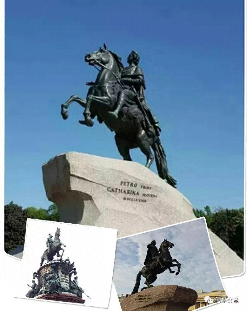 圣彼得堡给人的第一感觉是整洁干净。河水欢歌、树木葱郁、园林秀丽、环境幽静。被著名诗人普希金称为“青铜骑士”的彼得大帝(雕像)就坐落在城市广场中央。他跃马扬鞭于一块巨石上,坐骑下踩跃马扬鞭于一块巨石上,坐骑下踩着一条蟒蛇。这位俄罗斯罗曼诺夫王朝的第四代沙皇,在位期间推行政治、经济、军事等项改革,为俄罗斯在近三个世纪的“跨越式”发展中奠定了坚实基础。