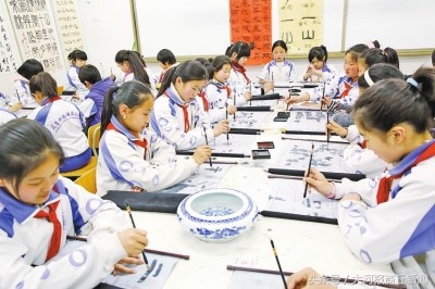 商东外国语实验学校学生在上书法课