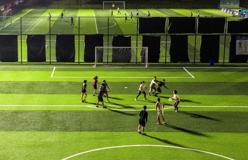 市民在成都市锦江体育公园足球场里玩飞盘。