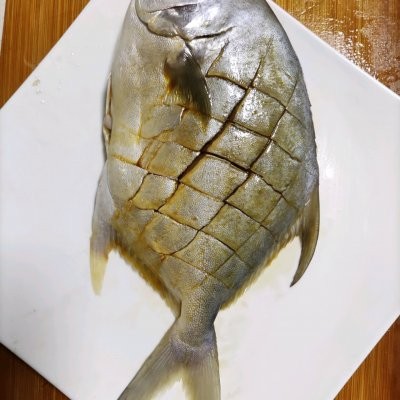 2、将鲳鱼改刀,撒少许的盐、酱油、料酒放旁边腌制10-20分钟