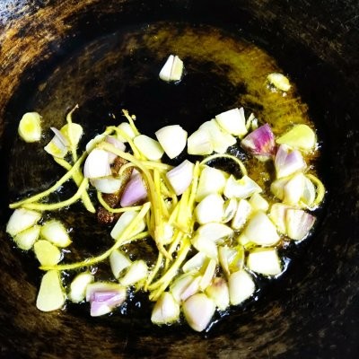 6、由于鱼有点大,果断换炒锅,将葱姜蒜爆香。