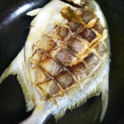 5、起锅烧油,放入腌制好的鲳鱼,将鱼煎至两面金黄后捞出备用。