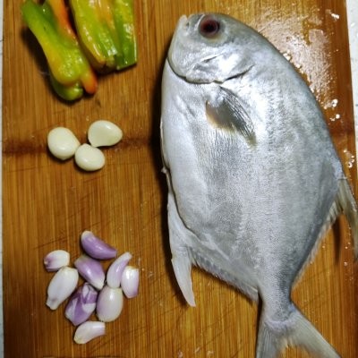 1、准备一条鲳鱼,1.5斤左右,配料小洋葱、姜、蒜、青红椒