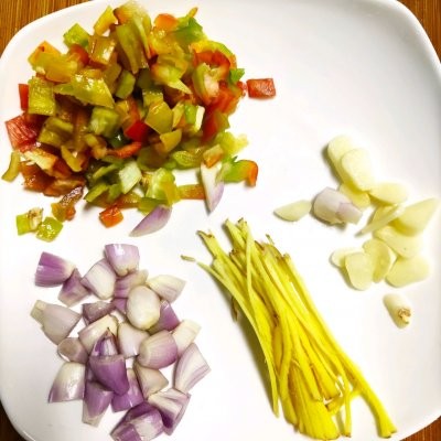 3、在腌制鱼的同时,将葱姜蒜切丁切丝备用。
