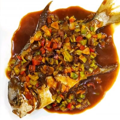 金鲳鱼 一条姜 适量蒜 适量白洒 适量料酒 适量生抽 适量老抽 适量盐 适量冰糖 适量青椒 半个红椒 半个淀粉 适量辣椒酱 一勺