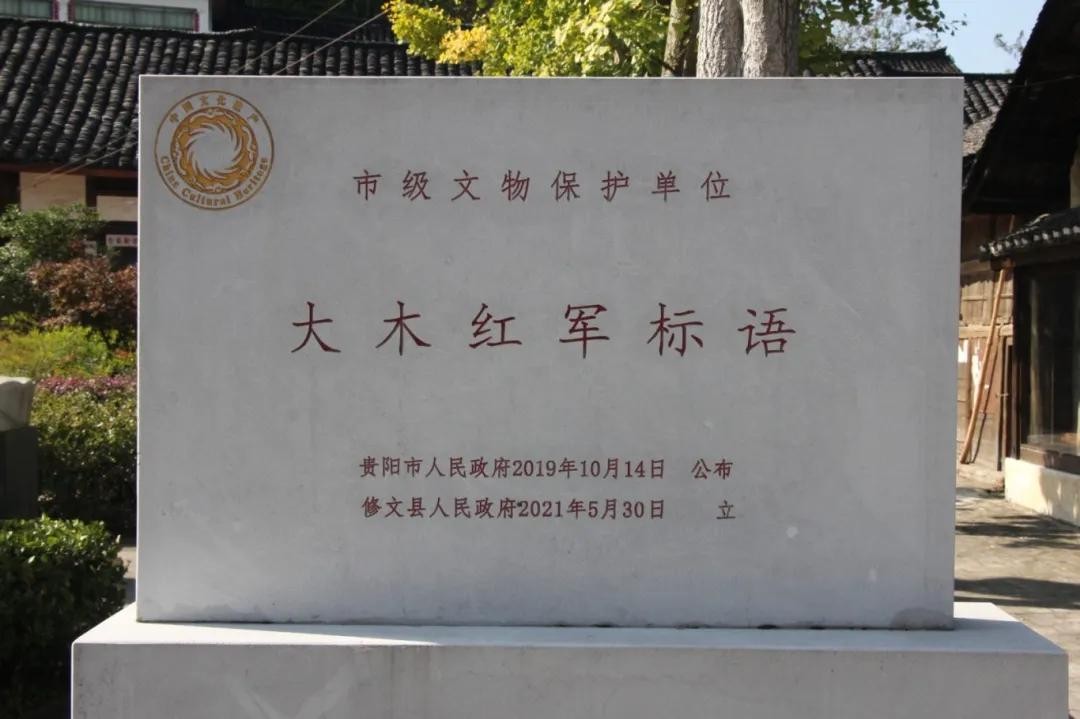 大木村位于贵阳市修文县六屯镇,是一座拥有600年历史的布依族古村落,村里有许多古老民居,墙壁上发现多幅字迹模糊的宣传标语,其中有一幅,就是红军长征途经这里所书写的大木红军标语,内容为:“红军是乾人的军队”(乾人即干人:指帮地主干活的穷人)。标语幅高70厘米、宽400厘米,1982年4月公布为县级重点文物保护单位,2019年10月公布为市级文物保护单位。