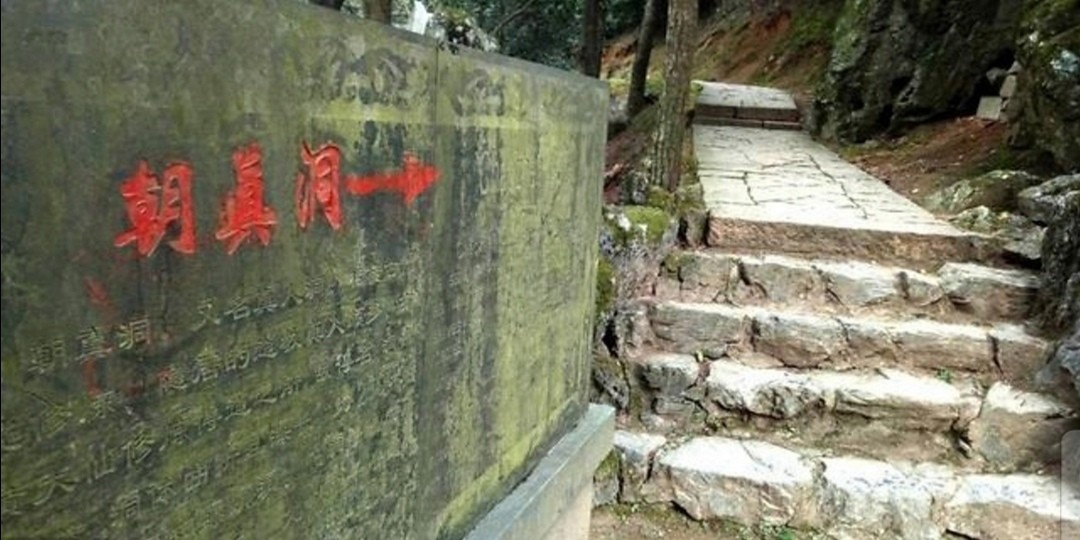 朝真洞的洞口向西,前临深壑,背依青峰。洞前眺望,四周群峰挺立,宛若百僧朝圣求真,洞名即由此来。洞中钟乳高悬,石笋遍地,其中一根大石笋形似“观音”,称“观音大士像”。洞的上方有一“天窗”,透进一束阳光,宛如半月,也称“一线天”。