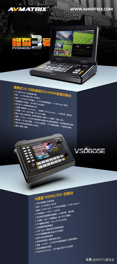 在今年的BIRTV展上,迈拓斯AVMATRIX将展示一系列令人期待的产品,包括视频直播切换台、采集卡、视频转换器、PZT摄像机&控制键盘、信号分配器、光纤延长器、矩阵切换器等。