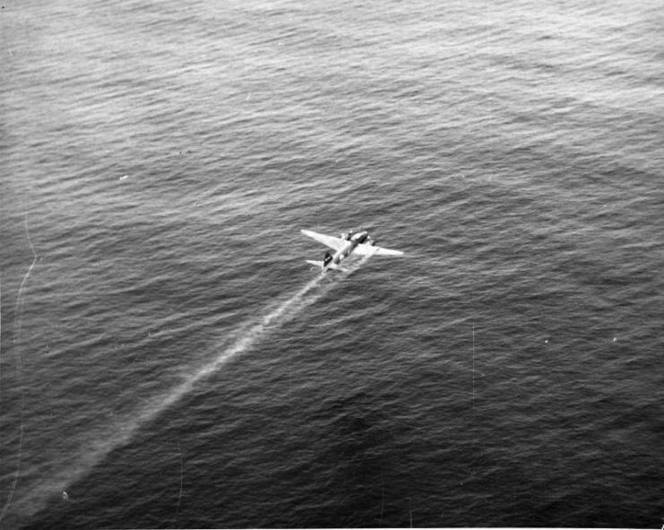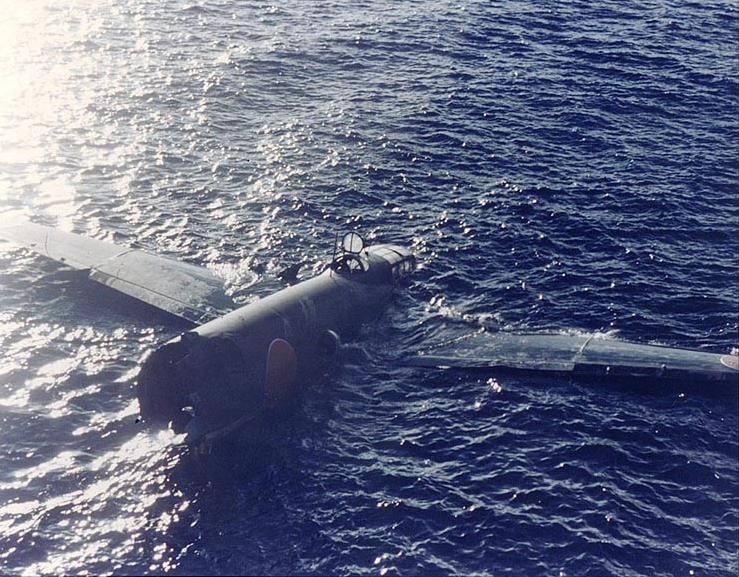 ▲1942年8月7日 瓜岛战役期间一架被击落的日军一式陆攻的残骸飘在水面上