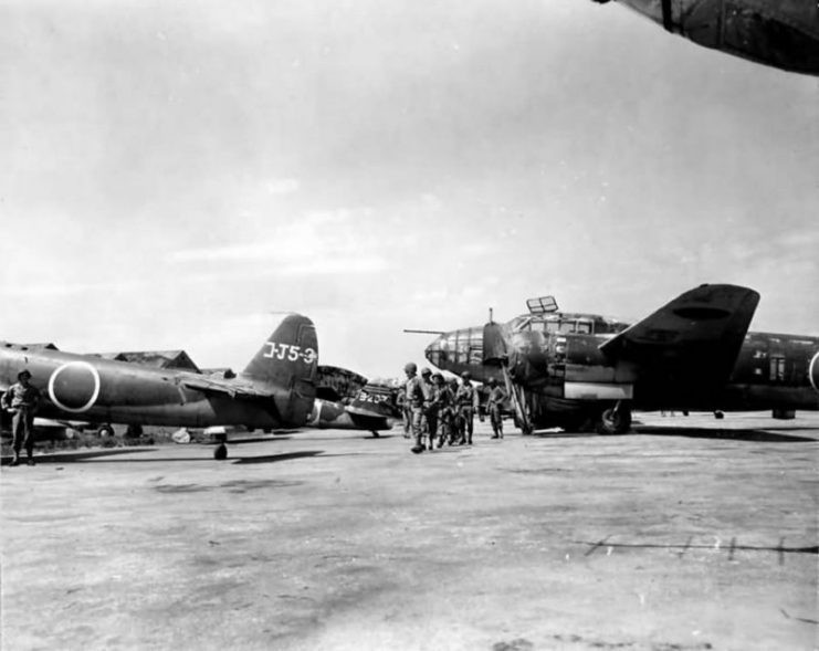 ▲1945年8月,停放在在横须贺海军基地的P1Y“银河”轰炸机和三菱一式陆攻