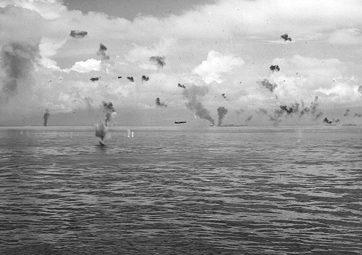 ▲1942年8月8日上午,日军一架一式陆攻在对瓜达尔卡纳尔岛和图拉吉之间机动的美国海军舰艇进行鱼雷攻击,这架飞机冒着防空炮火低空飞行。而画面中间远处燃烧的船只可能是美军的乔治-F-艾略特号运输舰(AP-13),它在这次攻击中被一架坠落的日军飞机命中
