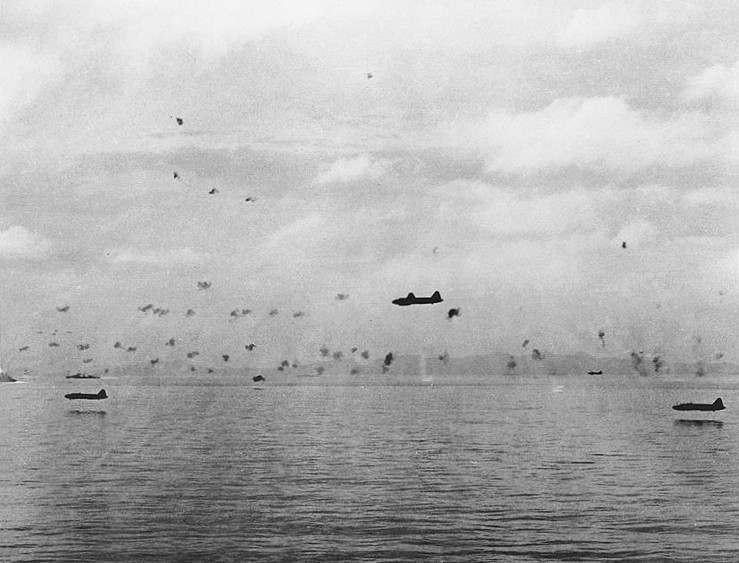 ▲1942年8月8日上午,一批正在进行低空突防,朝美军战舰发起鱼雷攻击的日军一式陆攻