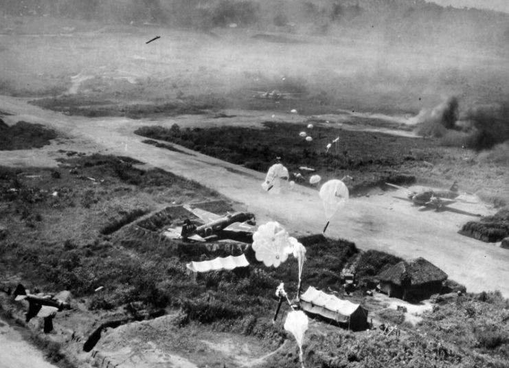 ▲在拉包尔机场上空,美军轰炸机低空向地面上停放的日军一式陆攻投放炸弹