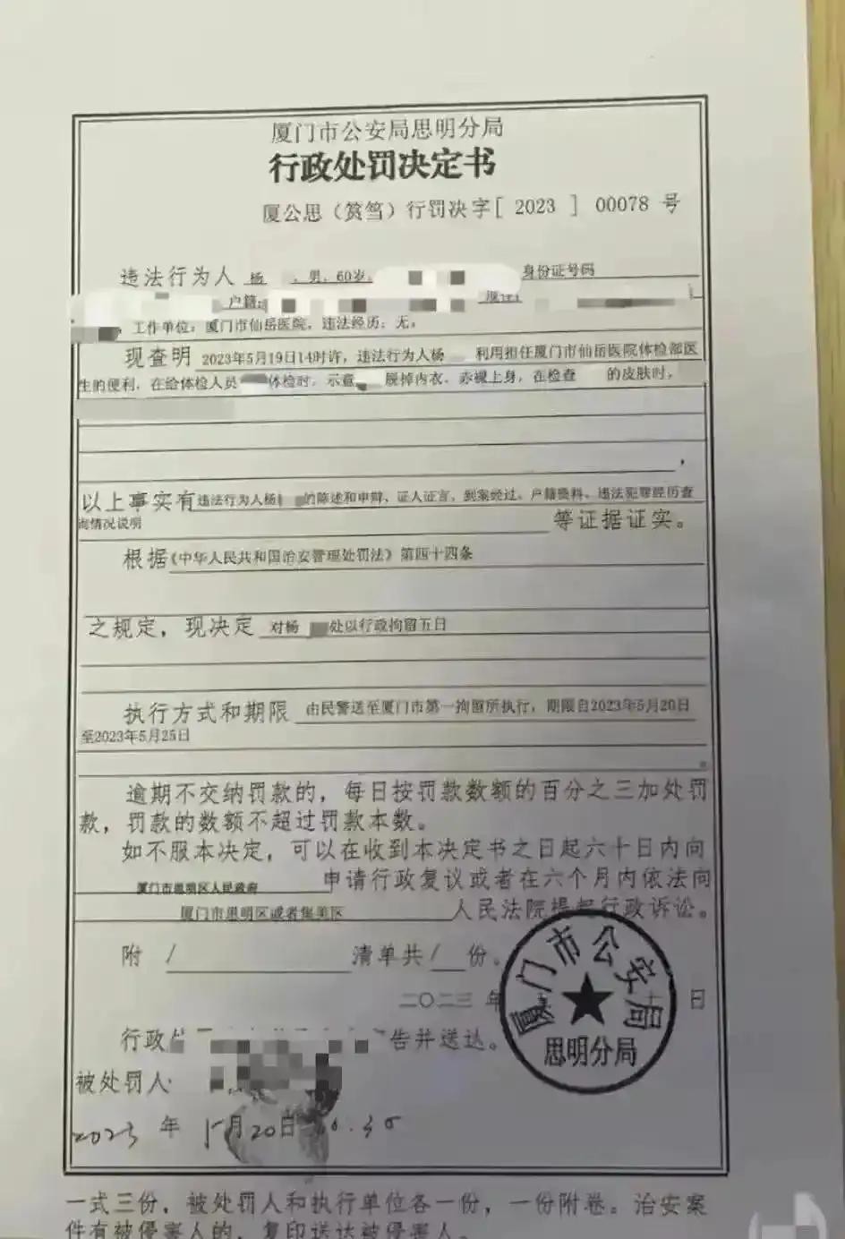 目前,涉事医生因猥亵妇女一案,被警方行政拘留5日。