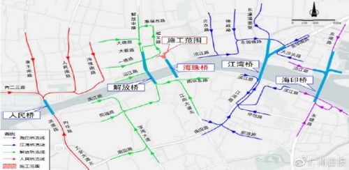 (二)珠江北岸原东往西经过海珠广场,7条公交线路绕行解放南路、大新路、大德路、沿江路: