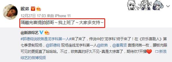 在消息传开之后,欧弟本人也转发了节目连线视频,并发文“隔离完喜提帅师哥,我上班了,大家多支持。”