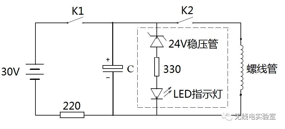 电容充好电后,其两端电压将与电源相同,此时按下K2,电容与线圈组成RC放电回路。电容会迅速放电产生很大的电流,使线圈产生一个强磁场,把我们的回形针”炮弹“发射出去。
