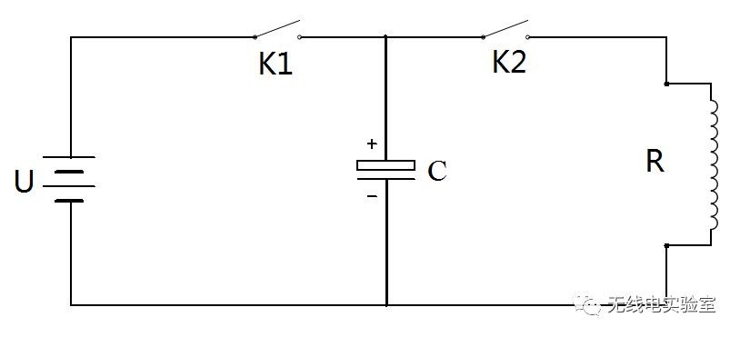 上图是简单的电容充放电电路图。按下K1给电容充电,充满电后松开按钮。这里可以在K1旁边串联一个300欧左右的电阻,把充电的最大电流控制在0.1A,这样虽然充电速度变慢了,但可以延长元件寿命。