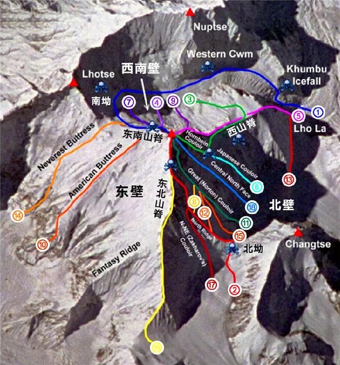 现如今,各国攀登珠峰的勇者们已经开创出了19条登顶路线,危险难度各不相同,有高难度路线,也有相对容易的路线。