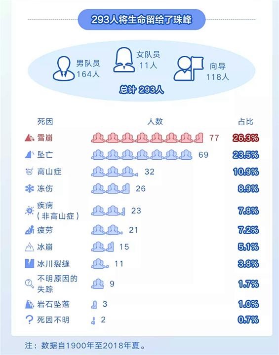据有关数据统计,登山者在攀登途中,雪崩是排名第一的“头号杀手”,紧随其后便是坠亡。