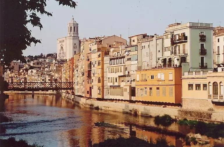赫罗纳位于巴塞罗那以北100公里处。早在中世纪时,这里就是有名的犹太人居住区。现在,寂静的小城依然保存有不少犹太人的遗迹。赫罗纳沿翁亚尔河(Onyar)右岸发展起来,城中大部分知名的古迹和老城区都分布在山坡上。老城四周曾经为城墙所环绕,可惜今天部分城墙已经不复存在了,但是站在残垣断壁上,依然可以将美丽的屋顶和迷宫般的街巷一览无余。赫罗纳的魅力主要就在于它那由盘缠交错的小巷构成的错综复杂的布局,条条小巷被通往教堂的石阶路截断,石阶路两旁绿树成荫。