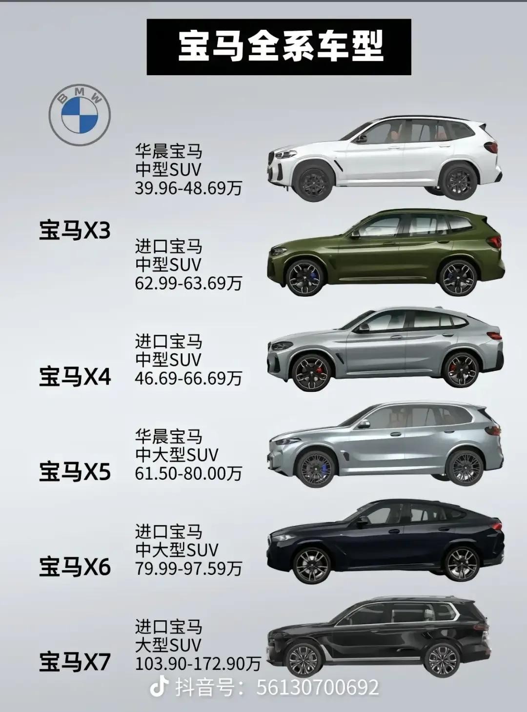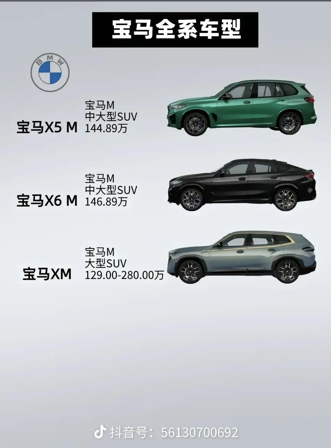 中大型SUV的华晨宝马X5价格61.50 - 80.00万 ,进口宝马X6价格79.99 - 97.59万 ,宝马X5 M价格144.89万 ,宝马X6 M价格146.89万 。大型SUV的宝马X7价格103.90 - 172.90万 ,宝马XM价格129.00 - 280.00万 ,它们拥有宽敞的空间和强大的性能,适合追求高端和舒适的消费者。