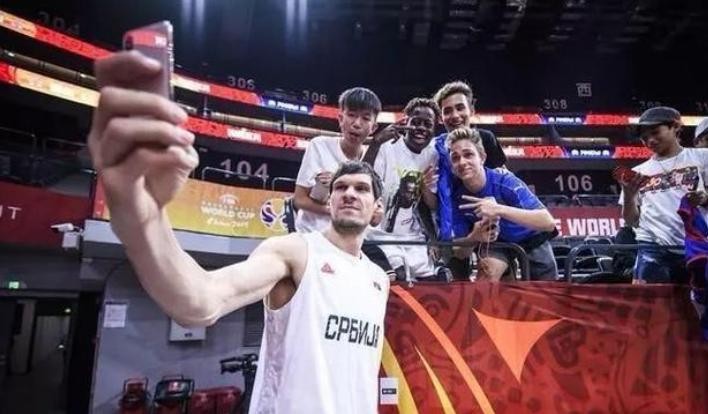 同样是在那届男篮世界杯,当时比赛结束后,一些塞尔维亚当地的球迷也是找到博班想要来一张合影。一位球迷也是将自己的手机——当时苹果最大的MAX手机送到博班手里,但是我们可以发现,即便是最大款的iPhone,到了博班手里也和一块儿麻将牌一样,而博班的长臂则完美承担了自拍杆的作用。