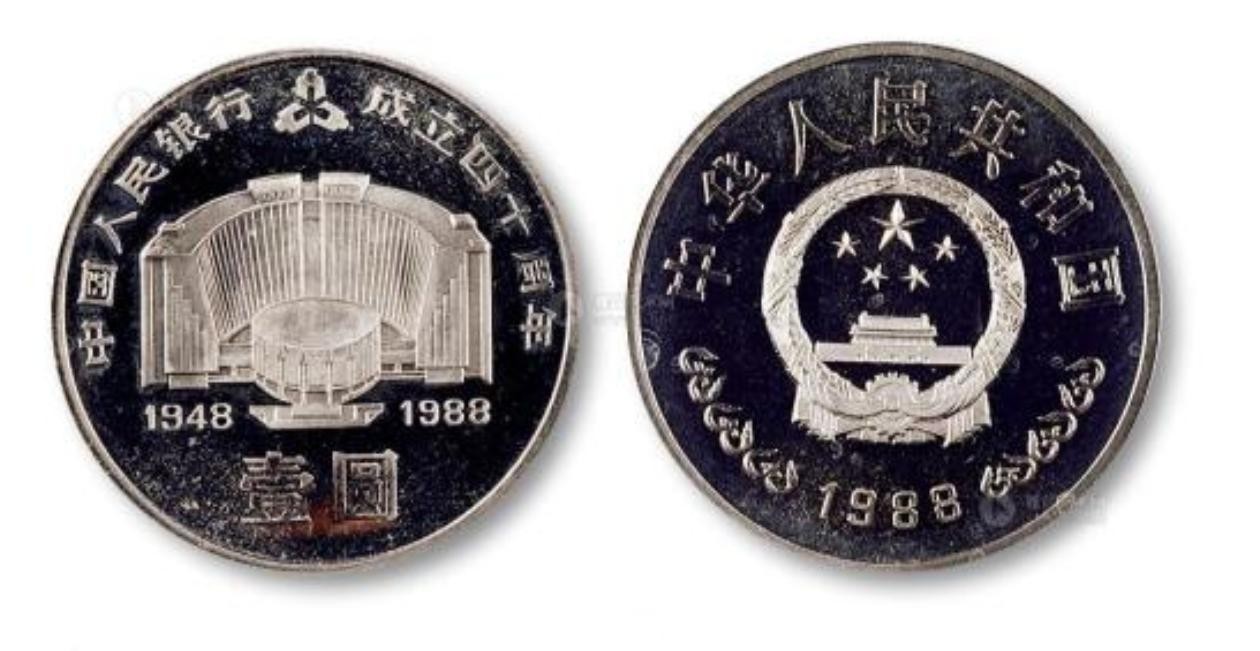 “建行币”的全名叫做“中国人民银行成立40周年”纪念币,发行于1988年12月,面额为1元,每套1枚。正面图案是国徽以及“中华人民共和国”的国名,下面有发行的年号还有一些装饰性的花纹,这便提高了这枚纪念币的观赏价值。背面的图案以中国人民银行的行徽和总行的办公大楼为主要背景。当时仅发行了206万枚。品相较好的裸币价值都在2000元以上,带光的或者评级高分币价格越高。