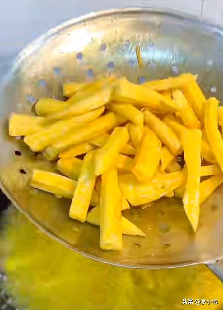 起锅烧油等油热后裹好淀粉的地瓜直接下锅,保持大火一直炸就可以了。地瓜炸熟后呈金黄色即可,捞出控油。