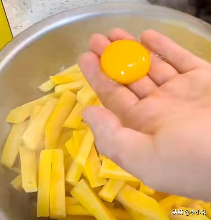 地瓜水份控干后准备一个没有水的盆,把地瓜放入盆里加入一个鸡蛋黄拌匀。鸡蛋黄的作用是给地瓜上色,然后加入两把玉米淀粉抓匀。要让每根地瓜都均匀地包裹上玉米淀粉,裹成每根地瓜都干爽的就可以了。如果还是发黏的话就再加一点淀粉,要不然地瓜太黏的话下锅炸的时候就会成坨了。