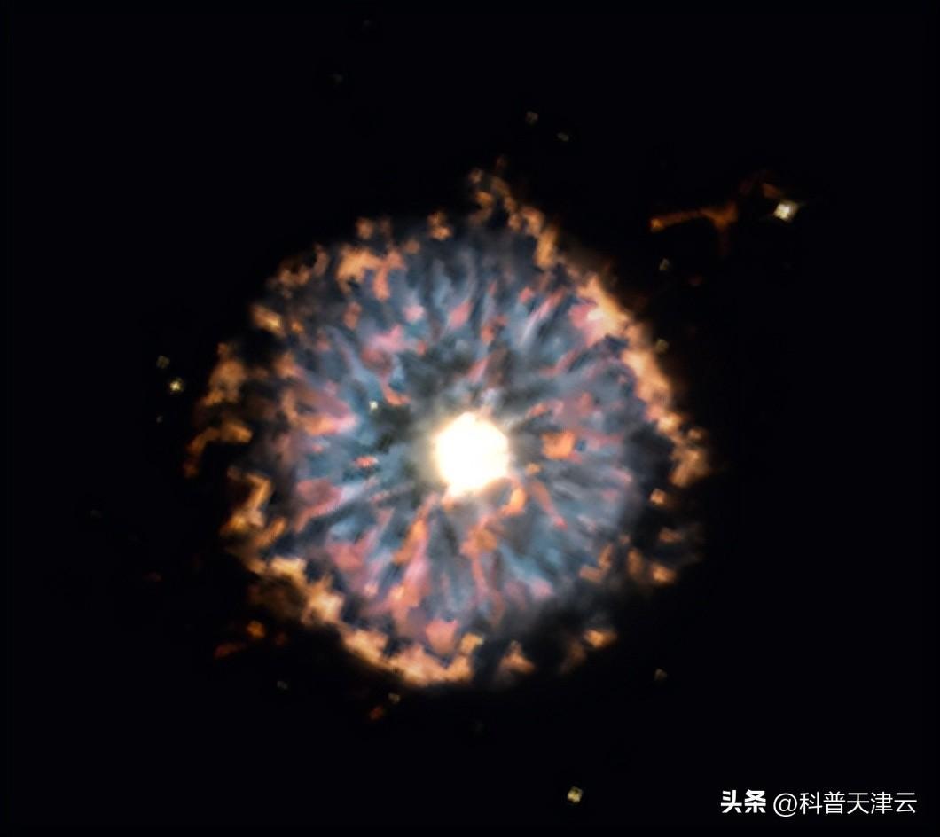 在天鹰座中的深空天体并不多,其中比较有代表性的为NGC6751,它又被称为亮眼星云或蒲公英星云,是一个行星状的星云,位于天鹰座西南侧的λ星附近,亮度约为12.5等,直径约为0.8光年,距离我们约为6500光年。在它的中心是一颗15.5等的白矮星,它的结构非常复杂,是由中心炙热恒星所产生的快速膨胀的气体与几千年前抛射出去的较冷物质相互碰撞而形成的。