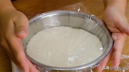 4、准备一个干燥干净的容器,刷层油防粘。搅拌好之后盖上保鲜膜温暖处发酵到1.5倍大,不要发的太大太满,不然会特别容易塌陷。