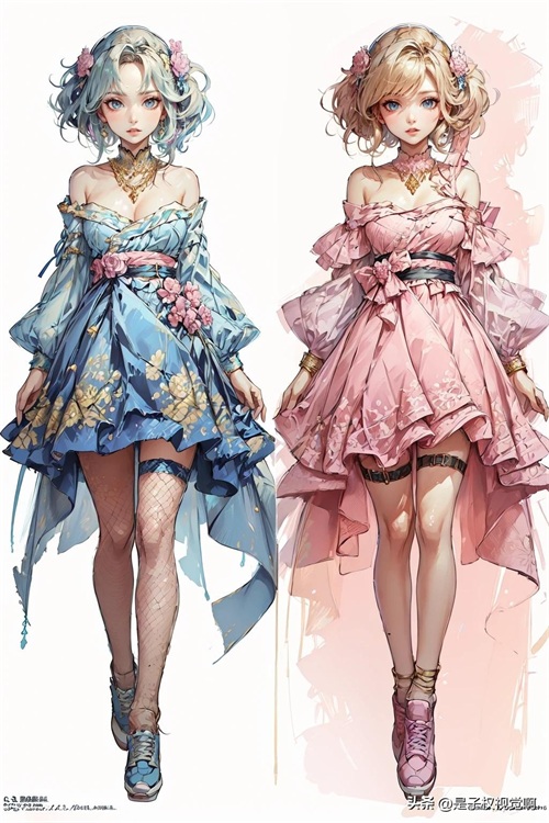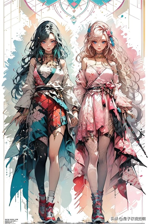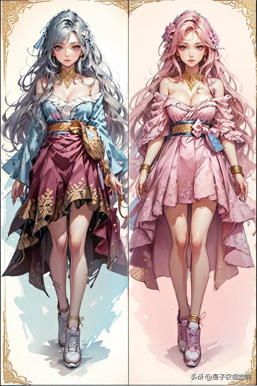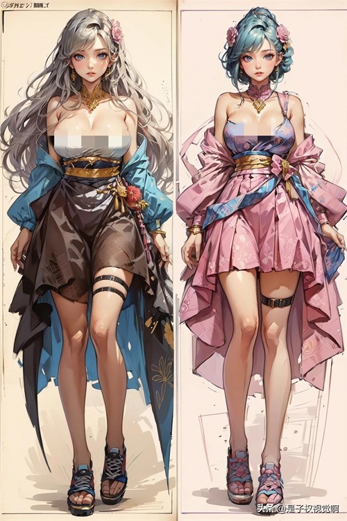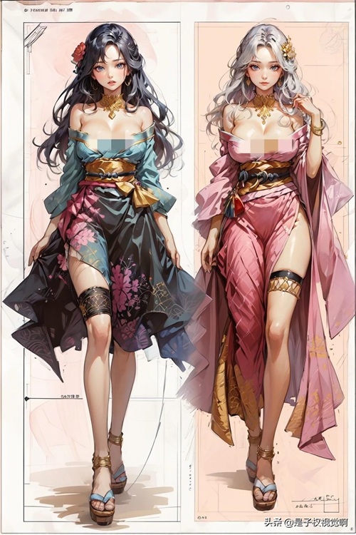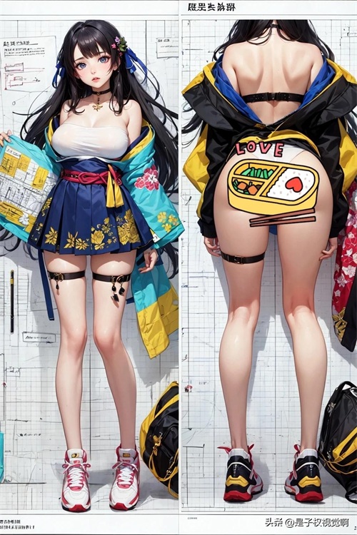 这组画面呈现了一场绚烂的视觉盛宴,将传统与现代完美融合,展现出一幅精美绝伦的画卷。首先映入眼帘的是一位身穿浮世绘图案抹胸上衣和浮世绘印花短裙的少女,她高挑修长的身姿展现出完美的身材比例,细腻的细节描绘尽显极致精湛。