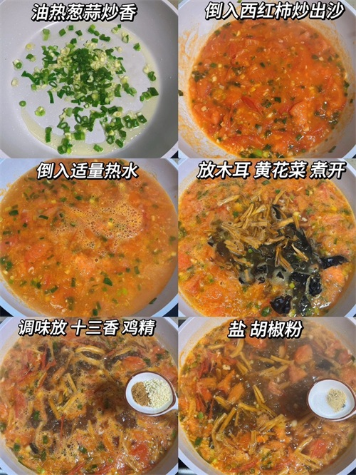 热锅凉油,加入葱花和蒜末,小火煸香,接着倒入切好的西红柿块翻炒,炒至西红柿出沙、汤汁浓稠。熬制酸汤