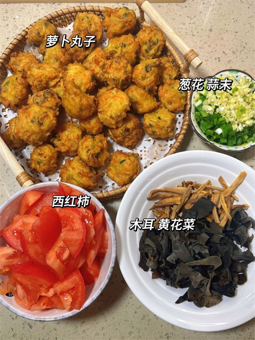 主料:萝卜丸子(自制或超市购买均可)配料:西红柿1个、木耳适量、黄花菜适量调料:葱花、蒜末、陈醋、十三香、鸡精、盐、胡椒粉、生抽、水淀粉、香油、香菜、蒜黄