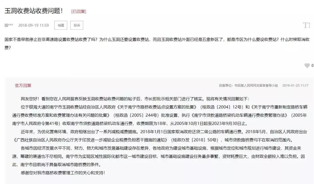 2018年,曾有网友在人民网《地方领导留言板》询问南宁玉洞收费站的问题: