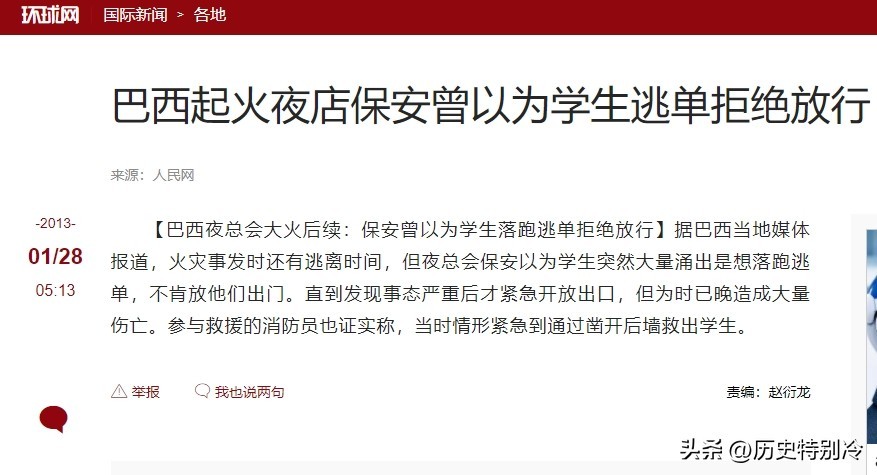 4、原文登载于人民网2013年1月28日:《巴西起火夜店保安曾以为学生逃单拒绝放行》