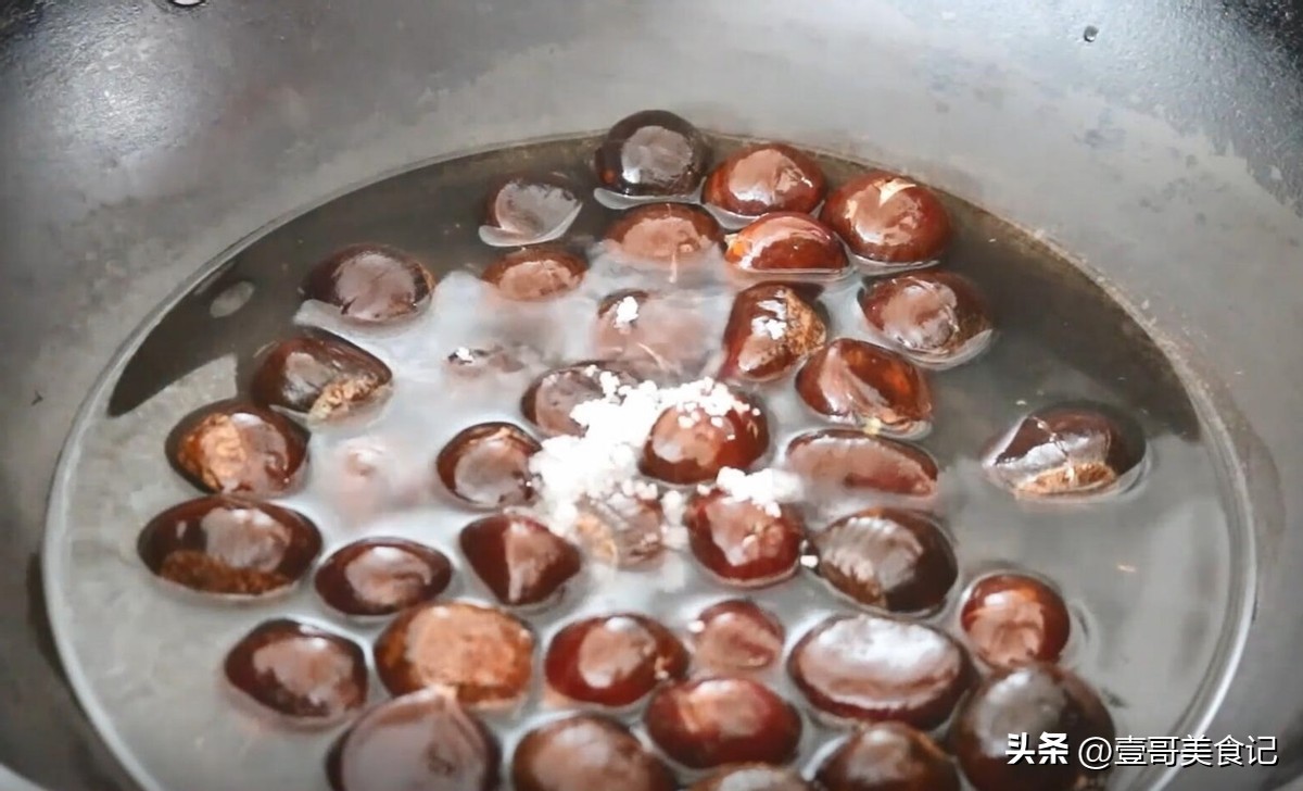 3.准备一口干净的炒锅,开大火加热。将剪好的板栗倒进热锅里,然后加入适量的清水,还要加入一些食盐,用铲子搅动着将食盐溶化。接着,盖上锅盖,要用大火将锅里的水烧开,煮板栗。
