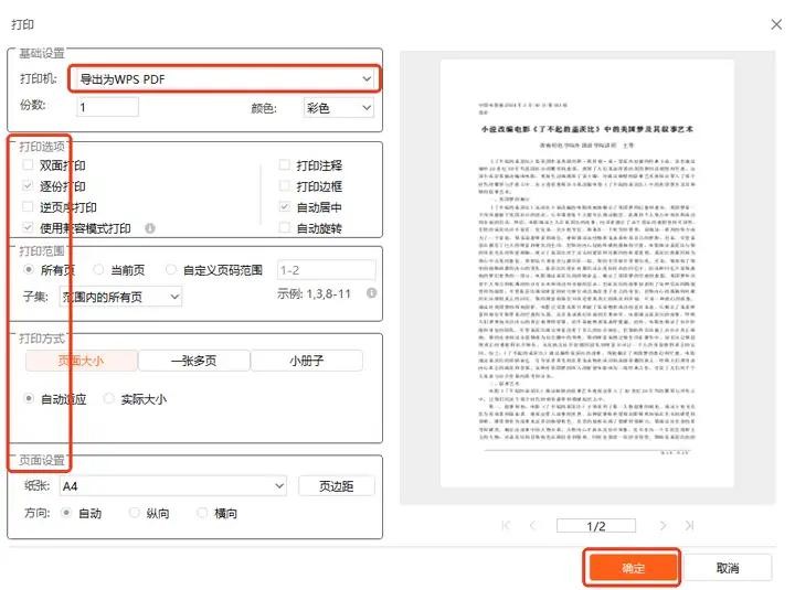 选择【导出为WPS PDF】,然后对转换后的PDF文件设置打印选项、范围、方式等参数,随后点击【确定】。