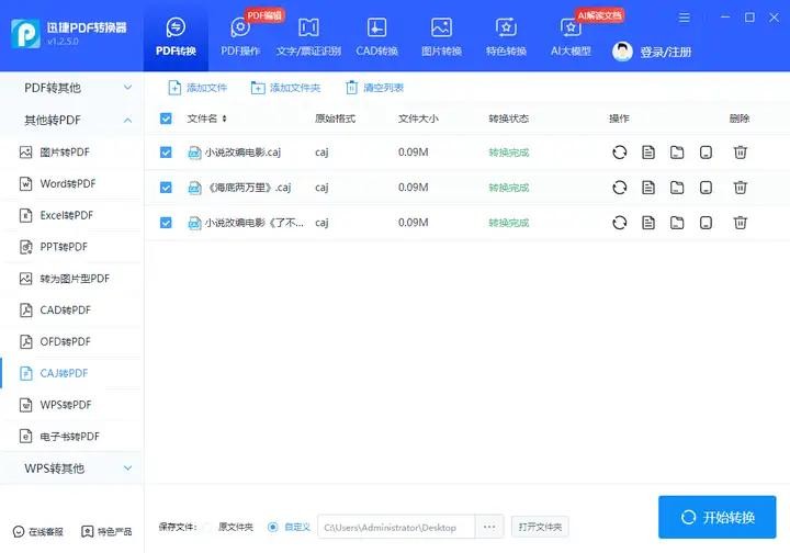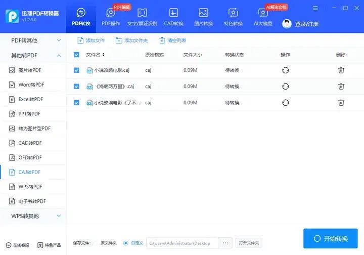 点击并上传多个caj文件,设置保存文件目录,最后点击【开始转换】。
