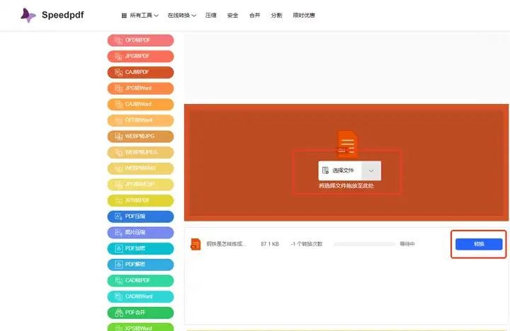 点击【选择文件】上传需要转换的caj文件,点击【转换】。