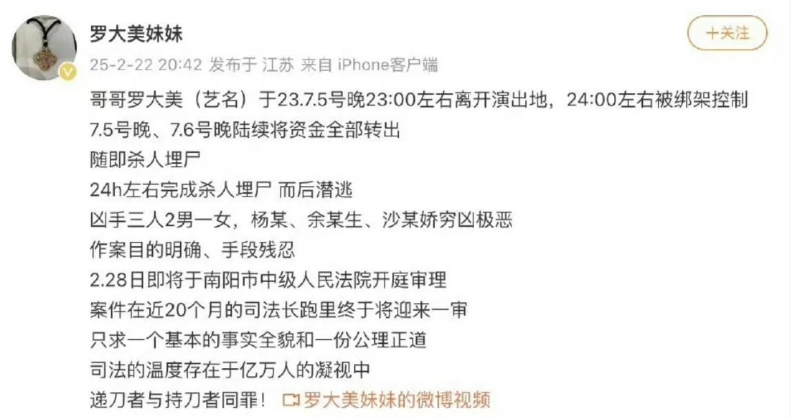 2023年7月5日,河南网红罗大美被熟人余某生以"朋友相聚"为由诱骗至南阳某出租屋,随后遭暴力控制并勒索200万元。转账后,罗大美仍被残忍杀害并藏尸红薯窖,其家人收到"撞人需躲避"的虚假信息,直至8月底察觉异常报警。主犯余某生潜逃缅甸豪赌输光赃款,最终在偷渡回国时落网。案件将于2月28日开庭,家属含泪呼吁:“判死刑都不解恨!”这起案件不仅暴露熟人作案之险恶,更引发对网络时代人性贪婪的深刻反思。